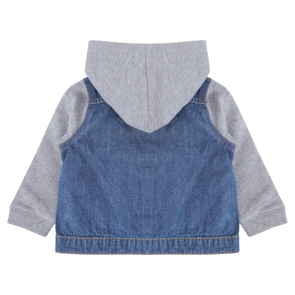 Kids denim jacket, with contrast sweatshirt hood and sleeves. YKK popper fastening down front and twin check pockets with flaps. Jean-style stitching on body and knitted rib on cuffs. Tag-free. . SEDEX certified. BSCI certified.
