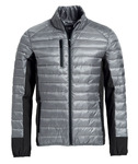 A modern jacket with down-like padding and softshell panels. 3 exterior pockets with zippers and 2 interior pockets. Earphone loop in the neck.